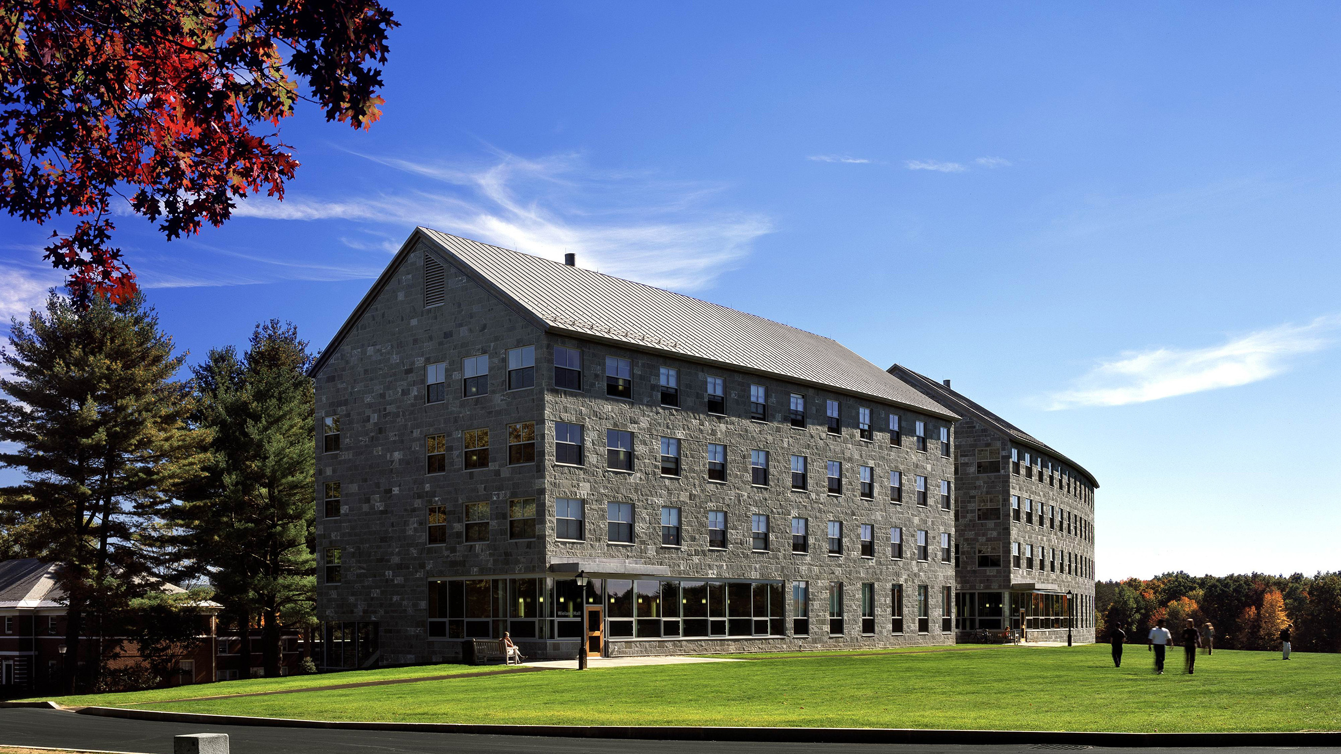 Two stone-clad residence halls provide housing for 105 students and are the first buildings for the East Campus Master Plan also developed by our firm. Sited along a gently sloping lawn, the buildings frame the view from this new campus sector towards the Holyoke Range beyond, acting as a transition between the more formal areas of campus and the athletic fields below.