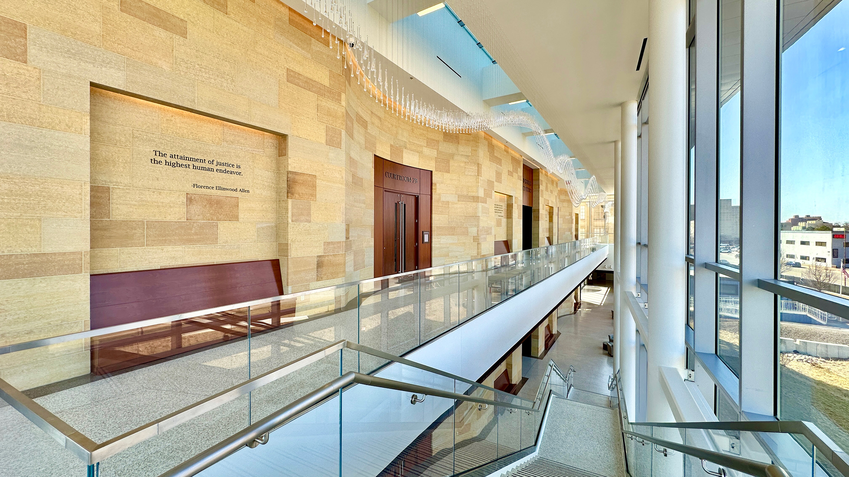 The “Glass Porch” of the Annex along Spielbusch Avenue boasts a double-height atrium highlighting the entrances to three District Judge Courts and one Magistrate Judge Court. This choice to open up the building to those viewing from the street is an intentional departure from centuries of traditional courthouse design. By removing the impenetrable walls at the front of the courthouse, the design allows for a great deal of light to come into the entry, bringing a sense of warmth and transparency to an important civic space. In this new Annex, justice truly is on display to all.