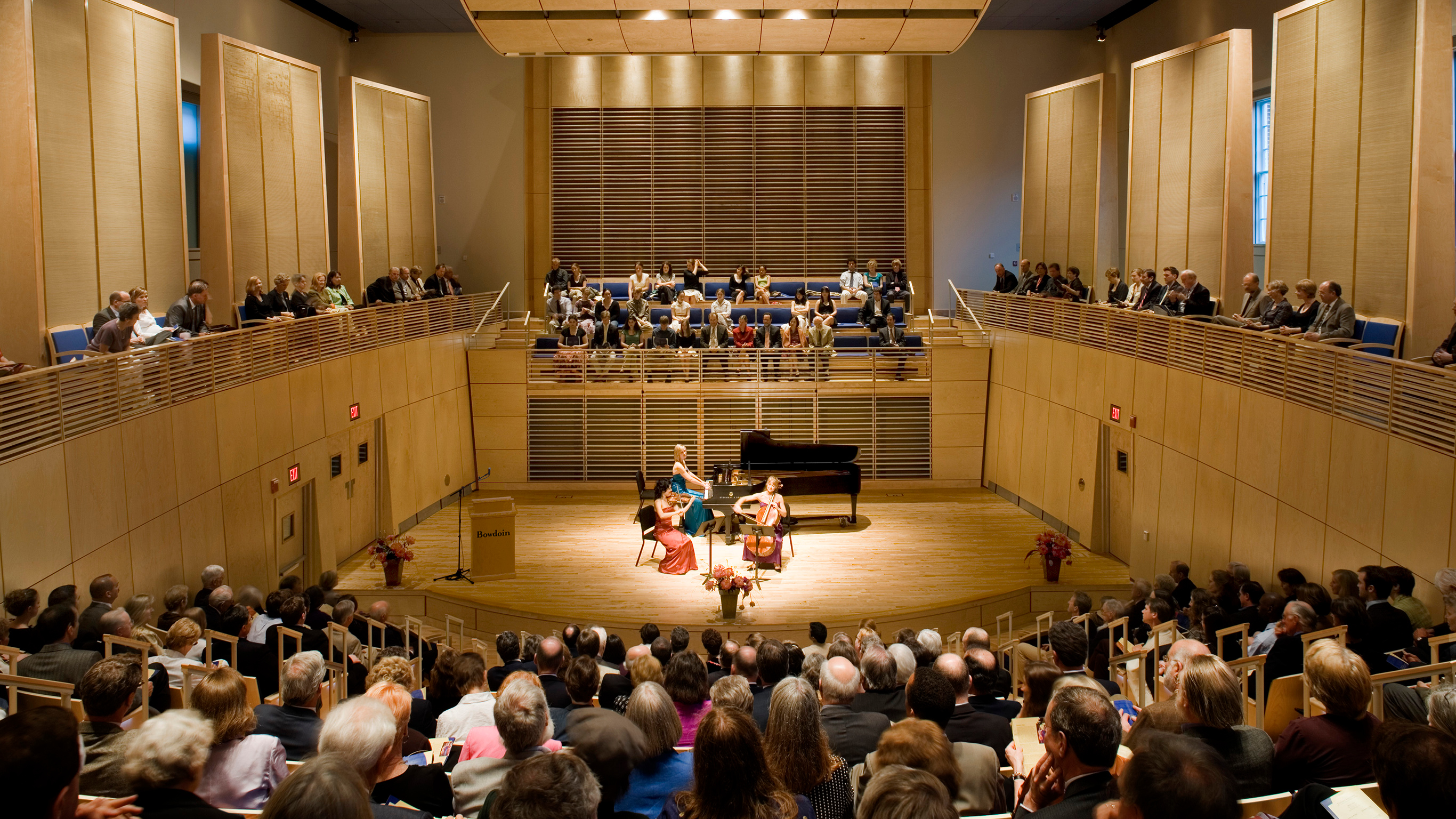 Recognizing the important role of Music and the Arts to a liberal arts education, we designed the building to meet the unique needs of student performers. Further, the Recital Hall was viewed as a place that brings the Bowdoin community together, a place of gathering and celebration. To this end, the Hall was conceived of as a warm, inviting space with natural birch woodwork and filled with natural light.