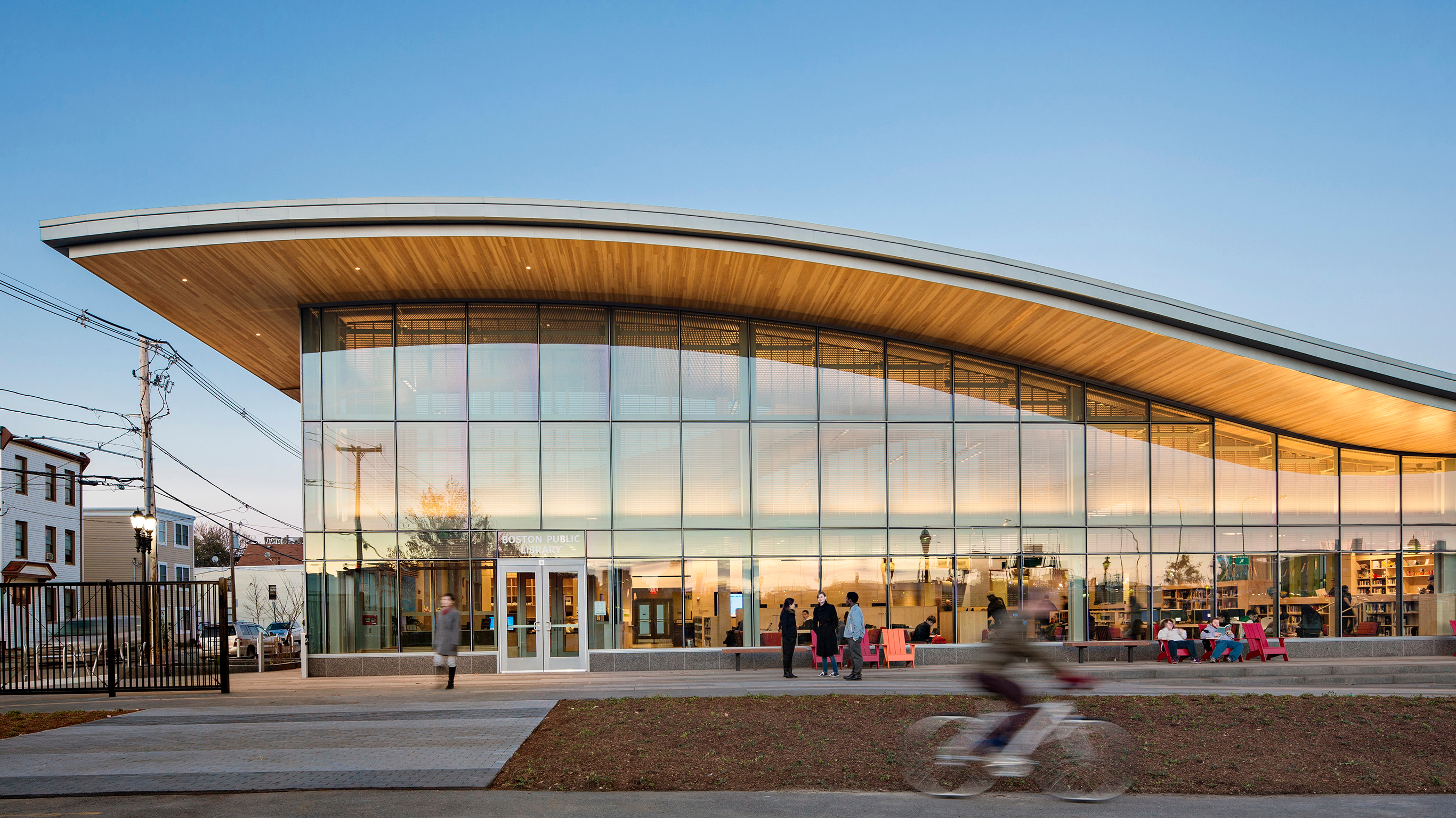 Overlooking the Bremen Street Park, the new East Boston Branch of the Boston Public Library serves the entire East Boston community, one of Boston’s fastest-growing and most diverse neighborhoods. The project includes an open-plan community reading room with views of the park and the Boston skyline, dedicated areas for adults, children & teens, a quiet reading room, a conference room and community space for multipurpose programs. A Reading Porch runs the length of the building along the park, providing outdoor space for reading, congregating, and using the wireless internet network. Flexibility and a focus on early literacy programming define this compact, technologically advanced branch library.