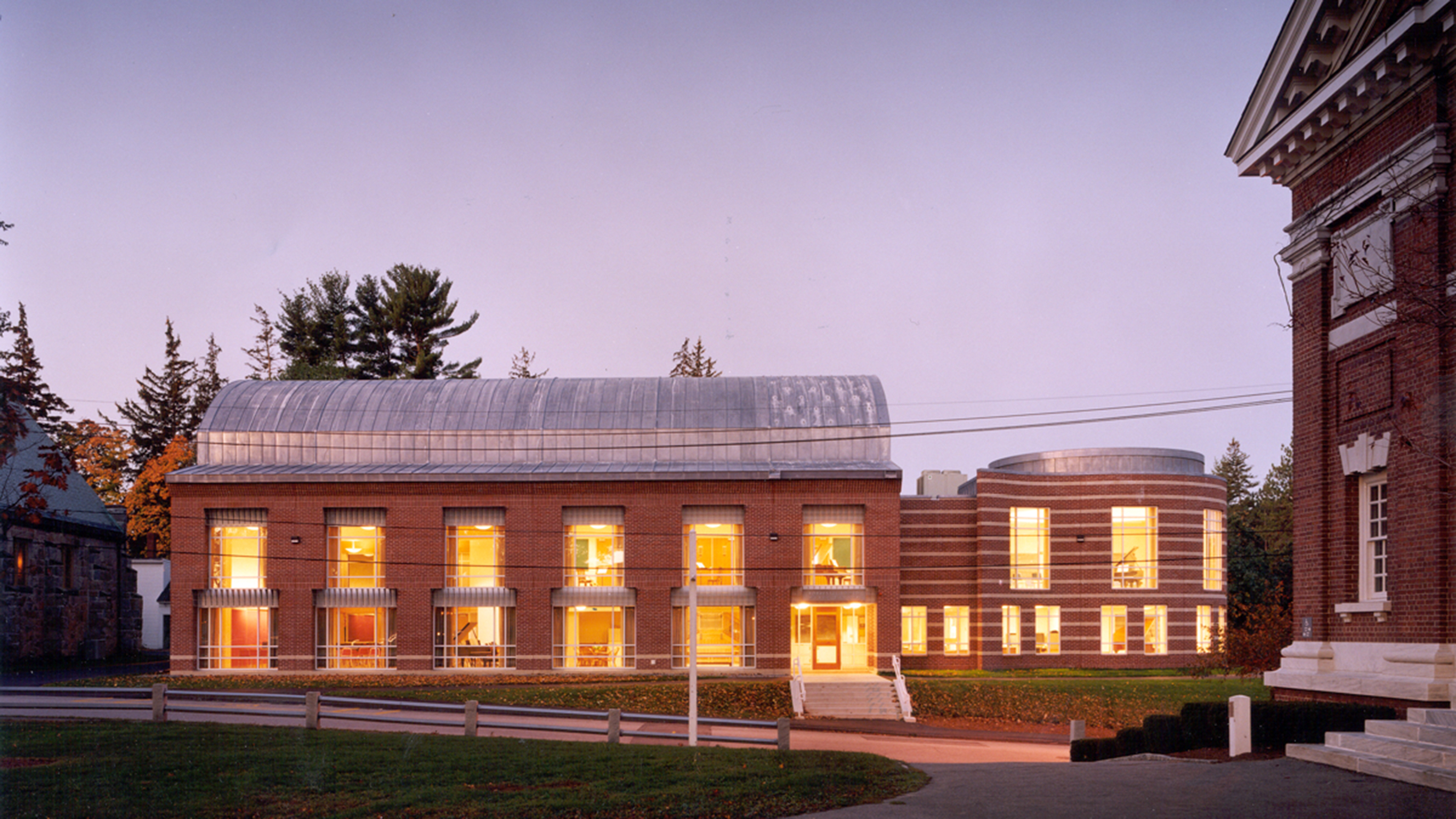 A contemporary design within a historic Georgian campus, the building is situated in a prominent location on the campus’s main quadrangle that is defined by the historic Phillips Church and Louis Kahn’s famed Exeter Library. Large windows connect the Main Quad to the building’s large interior courtyard space, practice rooms and main orchestra space, encouraging a sense of community for students.