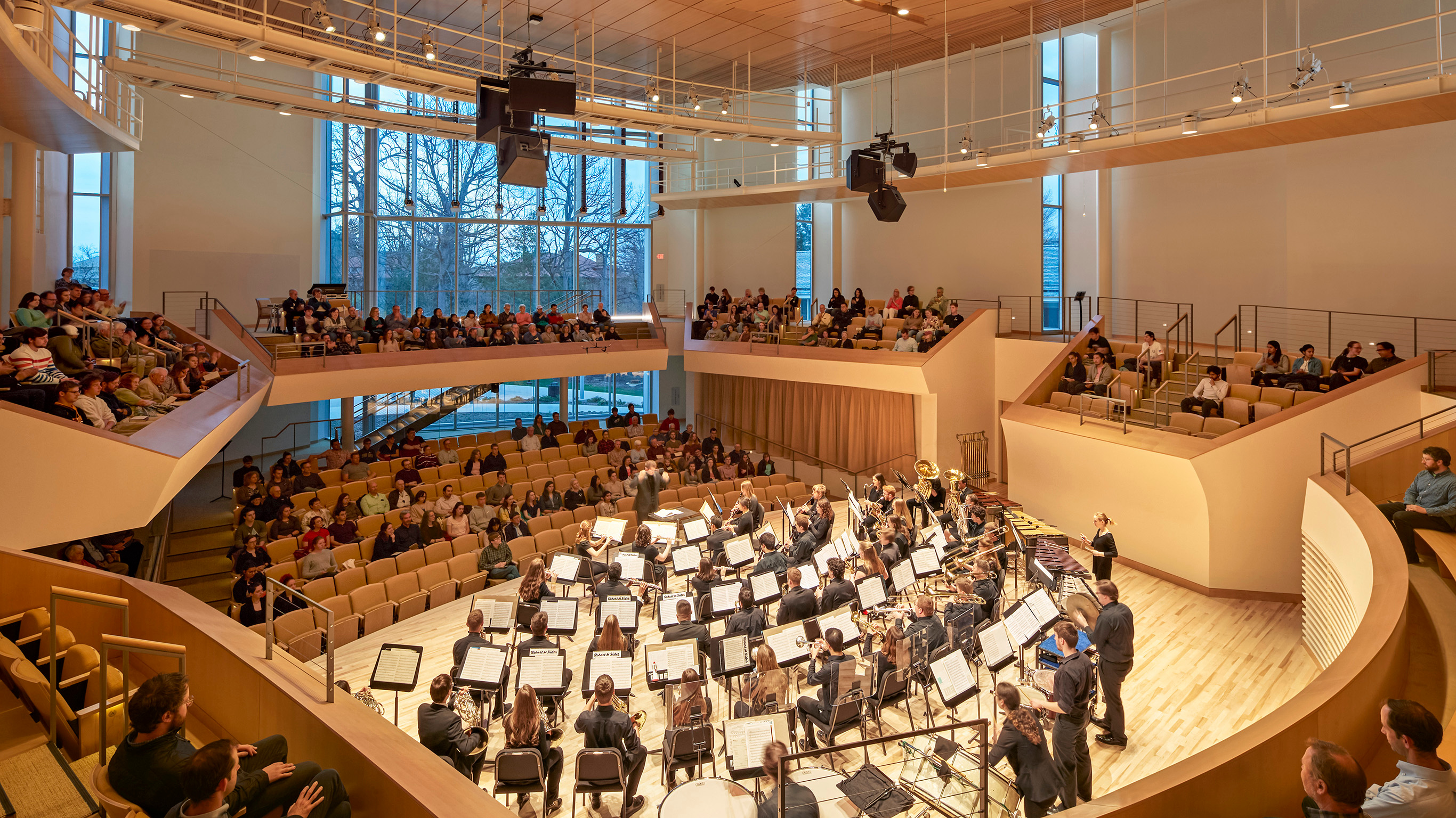 On the interior, the shape of the hall invites interaction between the audience and student performers. The first vineyard-style recital hall at this scale, the room is organized with audience seating circling the stage on four sides, maximizing intimacy (no seat in this 410-seat hall is more than 8 rows from the stage). Seating around and behind the stage is decidedly low, providing students in the audience with a perspective of a performer and allowing them to continue to learn what it feels like to be onstage even as they are watching their peer musicians.