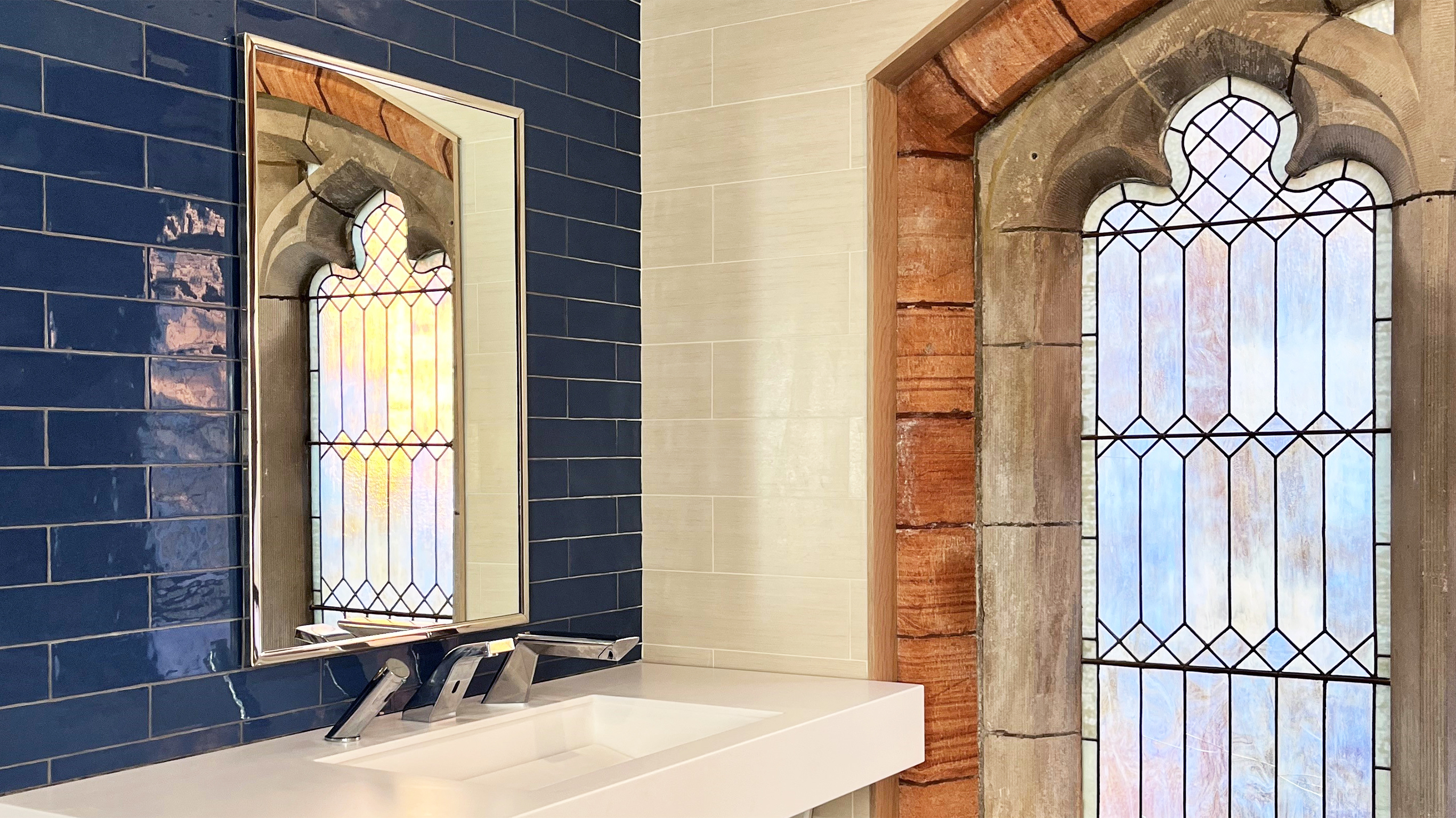 The restrooms integrate and highlight the historic features of the chapel such as the existing stained glass windows and ornamental trim. Two new genderless single bathrooms provide free access to all, and are particularly appreciated by walkers and bird watchers visiting the grounds. Amenities include a drinking fountain and bottle filling station, baby changing station, information bulletin board, air conditioning, and touchless soap dispensing and hand drying.