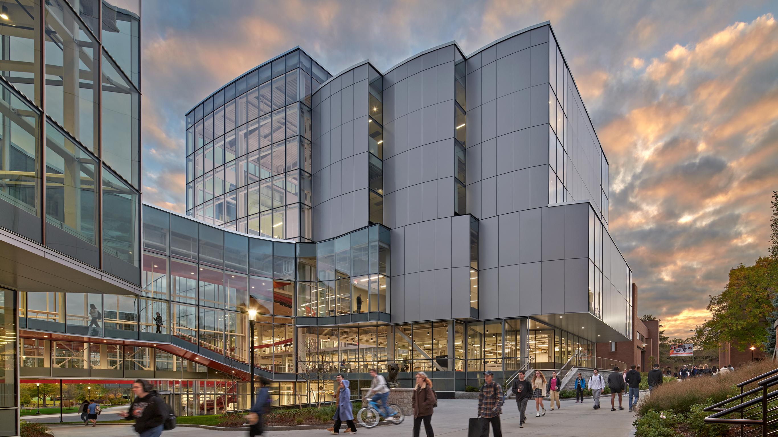 The Student Hall for Exploration and Development (The SHED), together with the renovated Wallace Library, creates a unique learning ecosystem – a creative hub with a focus on hands-on learning. Located along the “quarter mile” at the center of RIT's campus, the SHED and Wallace Library create an active destination for students and faculty from all disciplines at an important campus gateway and crossroads. The SHED spotlights RIT students’ creative collaboration, revealing maker and project team spaces on three floors, dance studios, rehearsal rooms, a glass-box theater, and numerous spaces for informal group study.
