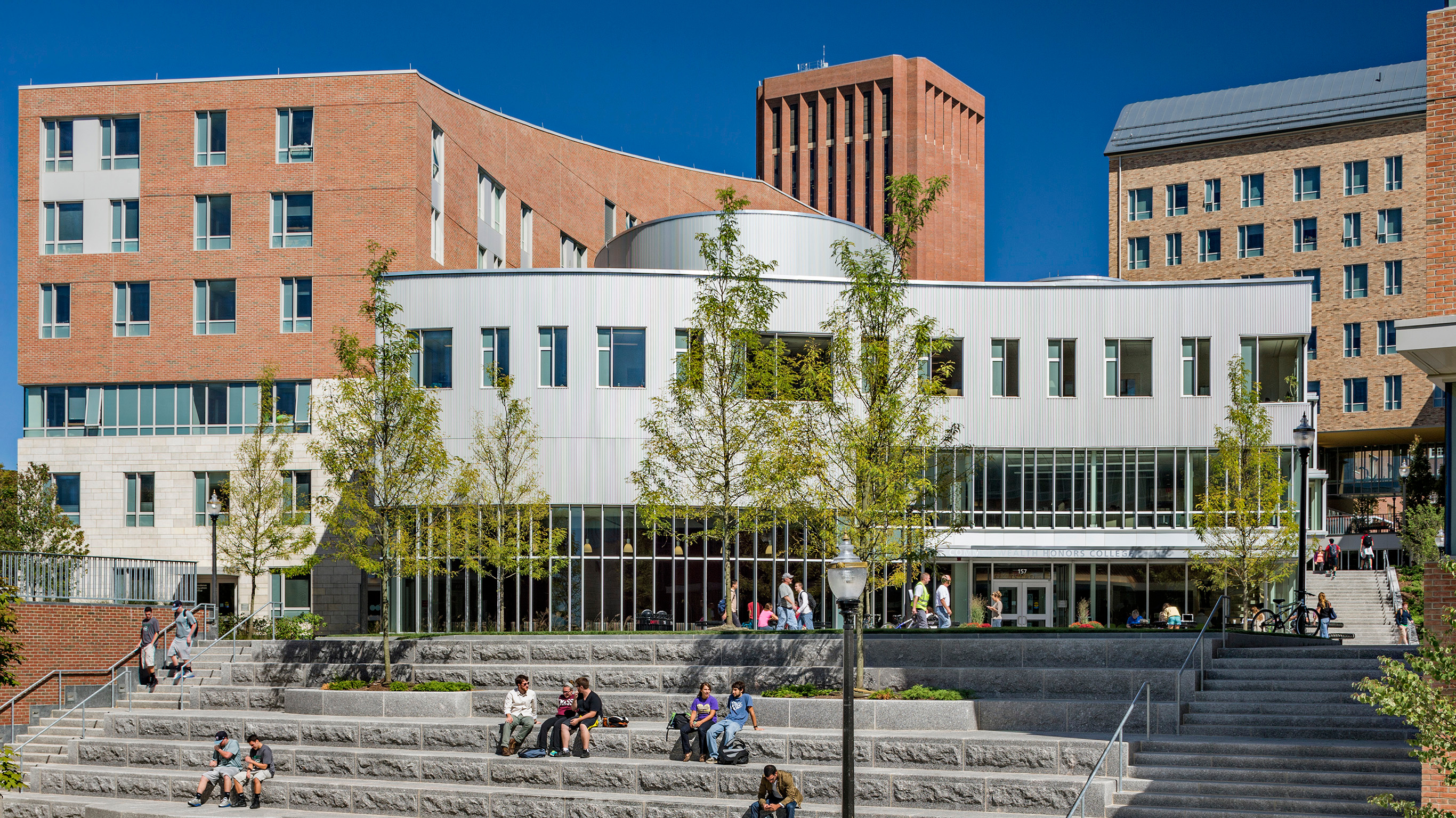 This residential complex provides 1,500 beds in seven buildings for the Honors Program of UMass Amherst, in the heart campus. Seven new buildings are organized around intimately scaled court-yards. The buildings step down the hillside, creating the sense of an academic village for the Honors College, with a series of open outdoor quads for students to gather. The project brings together Honors College students in a mix of unit types, including approximately 600 beds of singles and doubles, and 900 beds in suites and apartments.