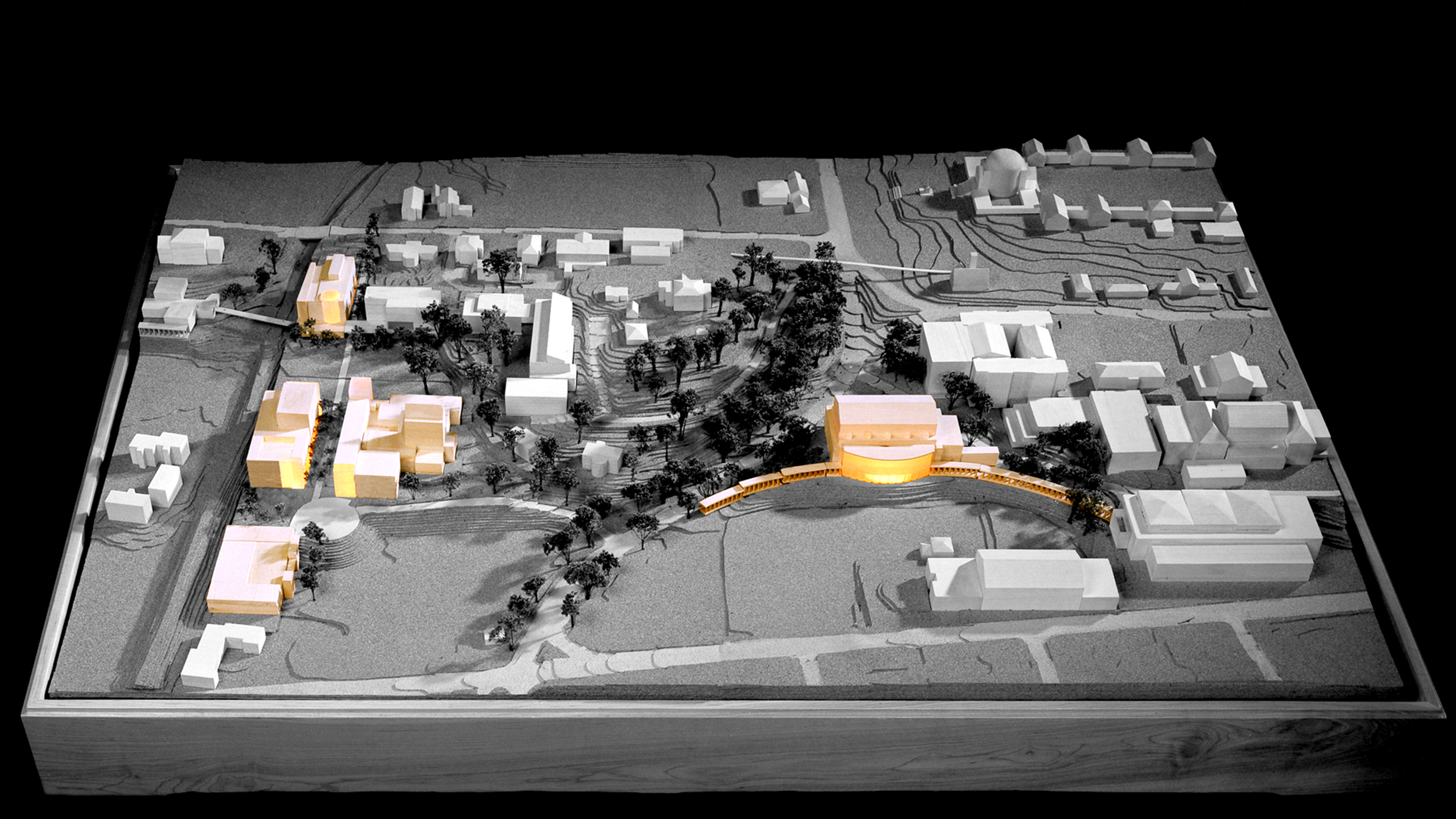 This conceptual design for a new Arts Precinct includes 3 new arts buildings: a 1,500-seat Performing Arts Center (for Theater and Concert Hall use); a new Music Building with a 300-seat Recital Hall; and a 300-seat Thrust Stage Theater, an extension to the existing Drama Building.