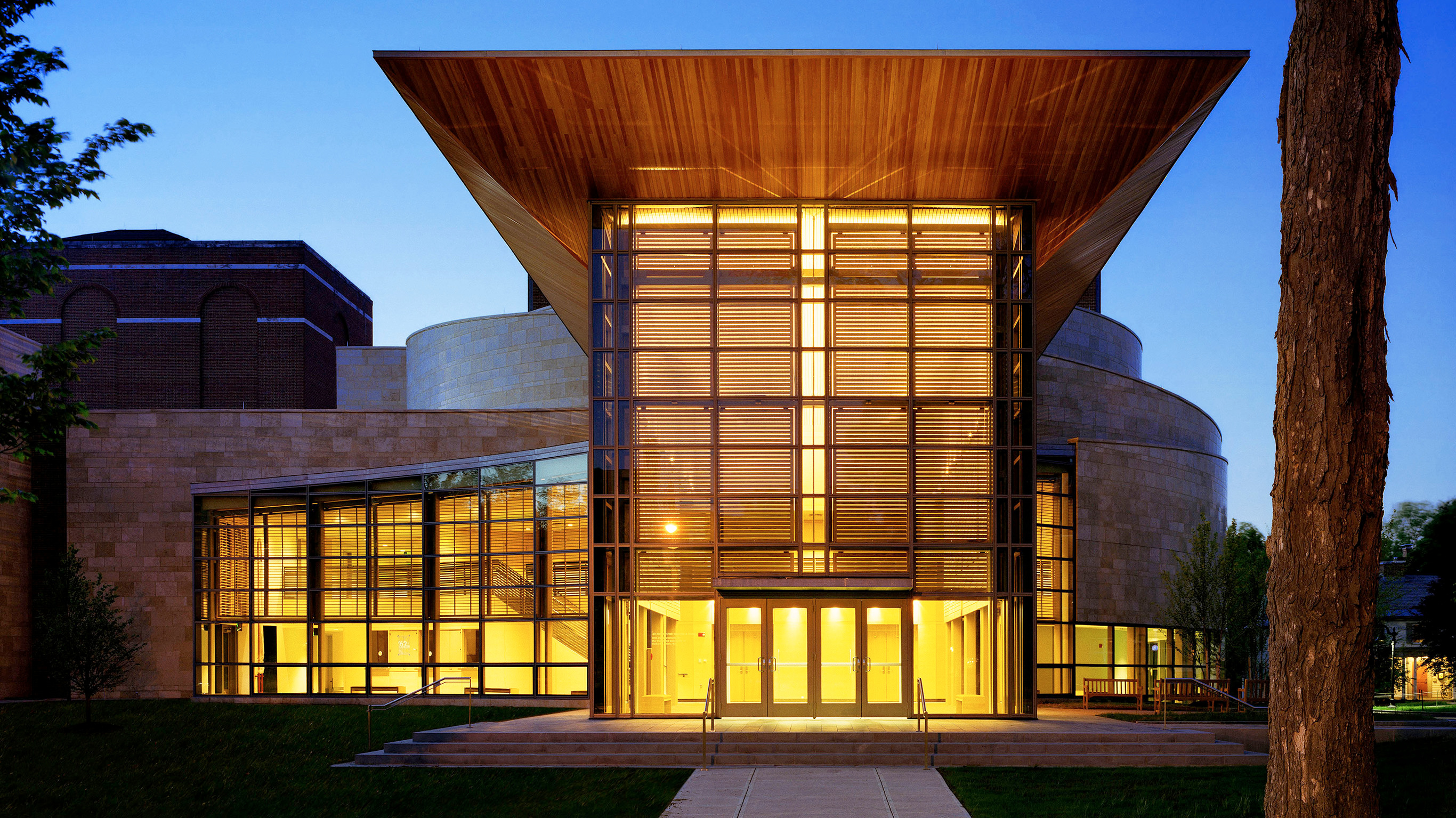 Located in a prominent position on Main Street, the ‘62 Center for Theatre & Dance emphasizes the importance of connections between theatre/dance and other disciplines on a liberal arts campus. Campus pathways weave through the building giving visitors and students a chance to see theatre and dance activities as they walk about campus. Most dramatically, a giant 20’ high steel barn door opens to reveal the inner workings of the CenterStage Theater along this path.
